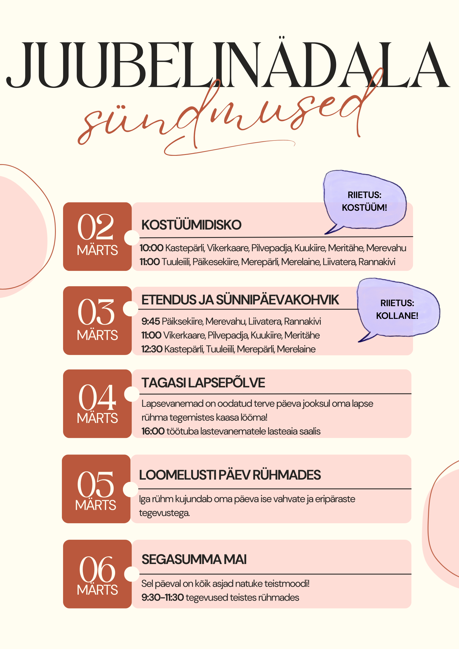 Juubelinädal sai hoogsa alguse esmaspäevase kostüümipäevaga, mil nii suured kui väikesed saabusid lasteaeda vahvates kostüümides. Liikumis- ja muusikaõpetaja eestvedamisel toimus saalis lustlik disko, mis tõi kõigile palju elevust.